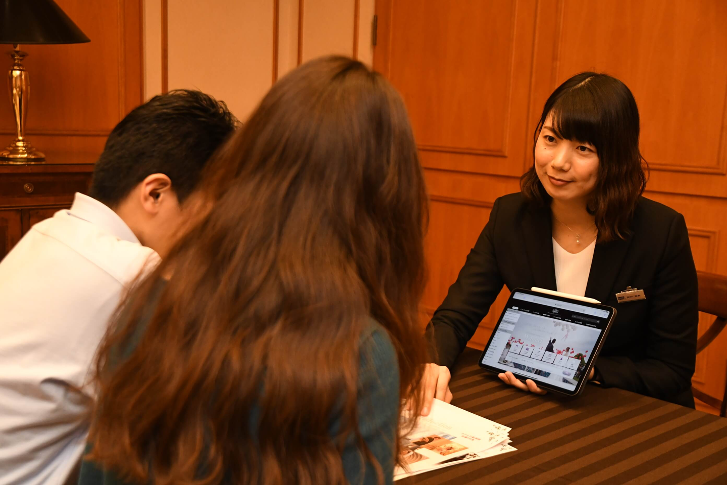 結婚披露宴の様々な演出を新郎新婦様にご提案して一緒に創り上げる仕事をしています。例えば当日流すBGMを新郎新婦様の考える披露宴のコンセプトに合うものを提案したり、照明のあて方、プロフィールムービーなどをどのように作成するかなど当日を彩る演出の細部に渡るまで新郎新婦様と一緒に作り上げています。また、ホテルでは一般企業さんのイベントも行われていますのでそちらの演出の提案も行っています。