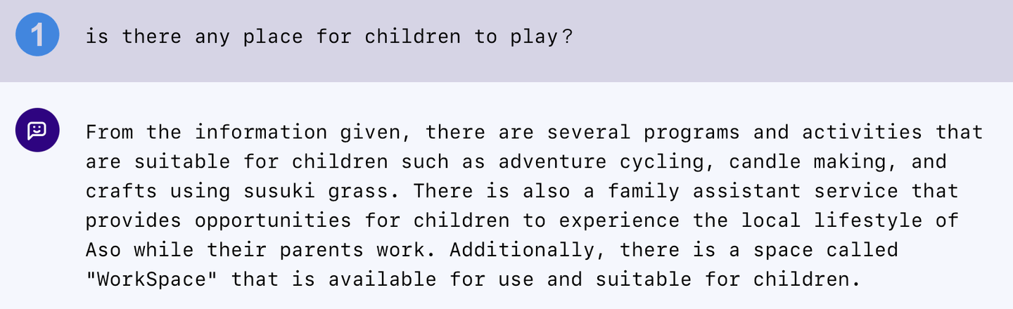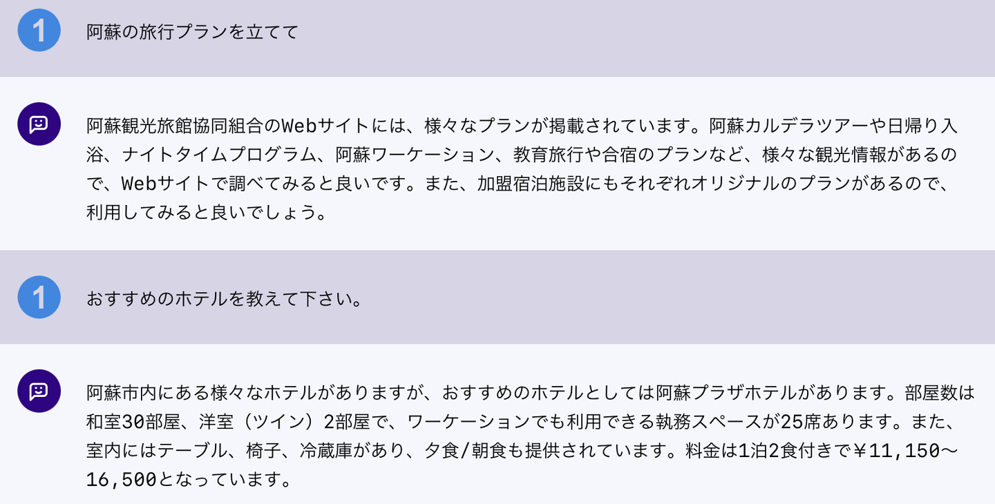 阿蘇温泉観光旅館協同組合のサイトデータを利用し、チャットボットを作成しました。このチャットボットは、協同組合加盟のホテルの情報提供にも対応しています。元のデータは日本語のみですが、英語や中国語など他の言語での質問にも、適切に現地言語で対応しています。