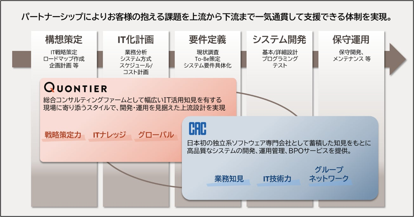 本提携により、クオンティアが得意とする戦略策定力、IT知見と顧客折衝力を活かした上流工程支援に、CACのIT技術力、業務知見、グループネットワークに基づいた高品質なシステム開発力が合わさることで、経営戦略策定からシステム実装まで一気通貫して支援し、お客様の抱える課題を両社が包括的に解決できる体制を構築します。