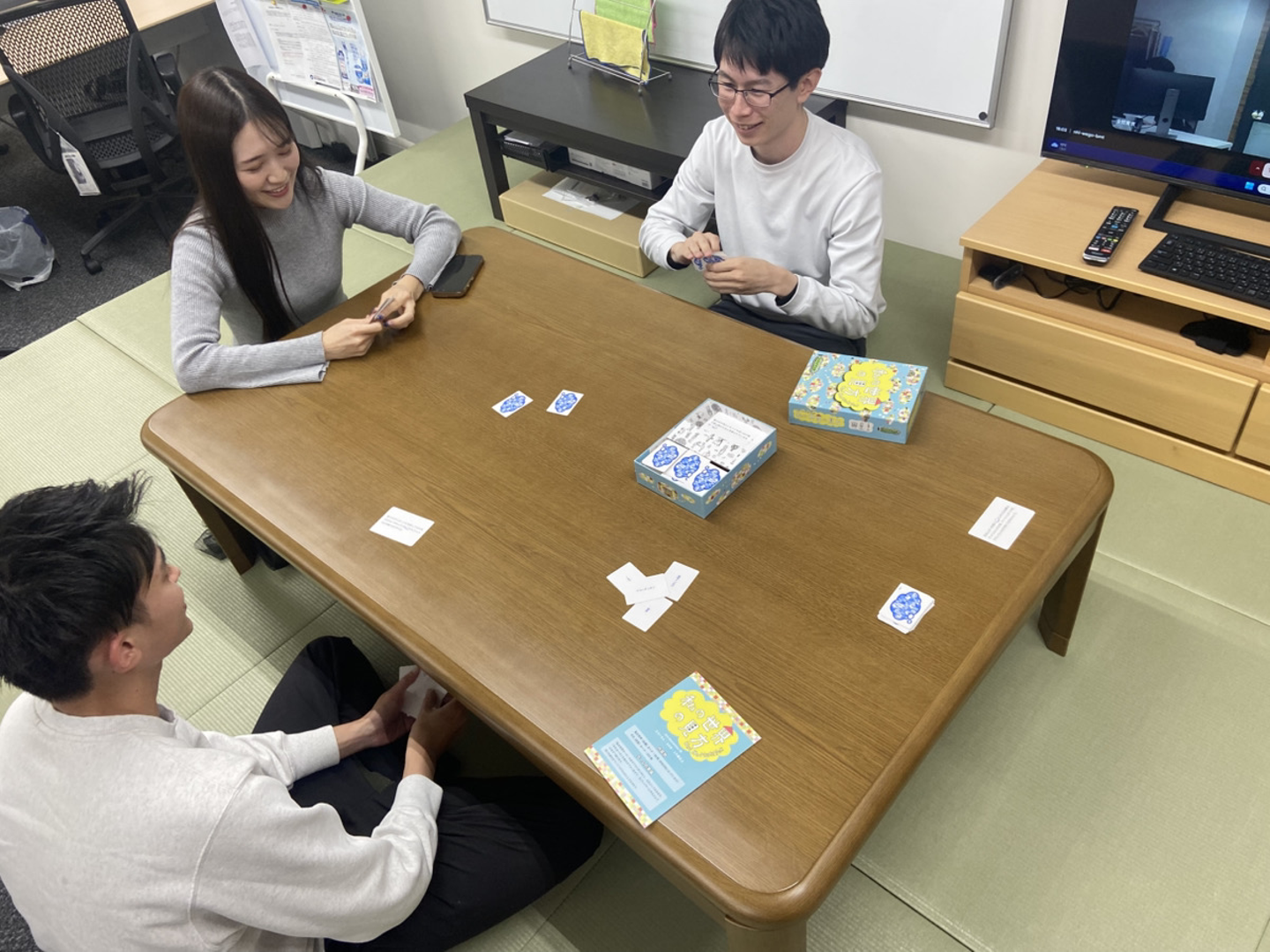 こちらの写真は、社内にあるボードゲームで皆さんとひと休憩している風景です。