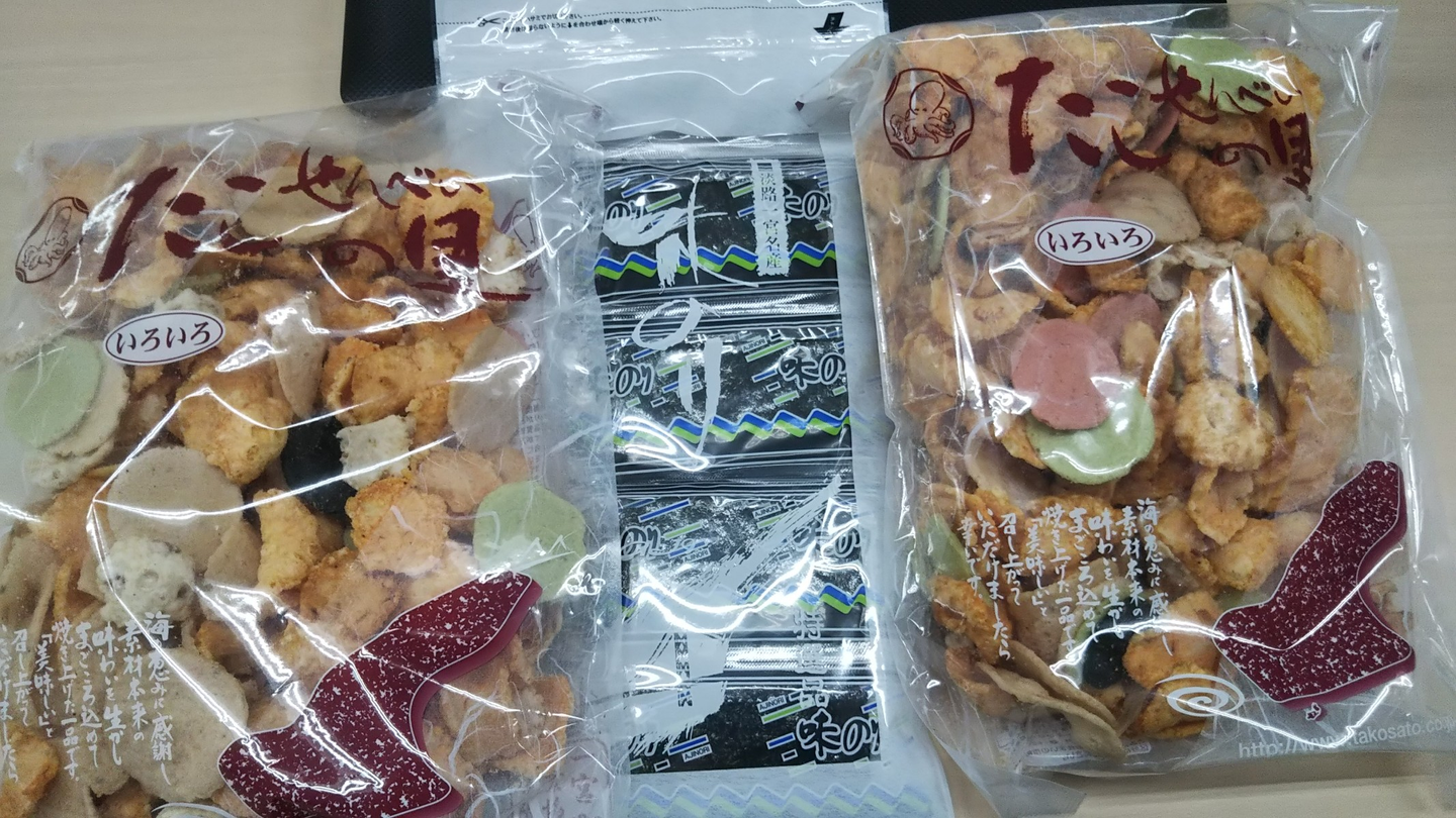 なかなか就職先が見つからず苦戦していましたが、無事に就職先が見つかった際のお礼として、画像に貼ったたこ煎餅と味海苔をもらいました!