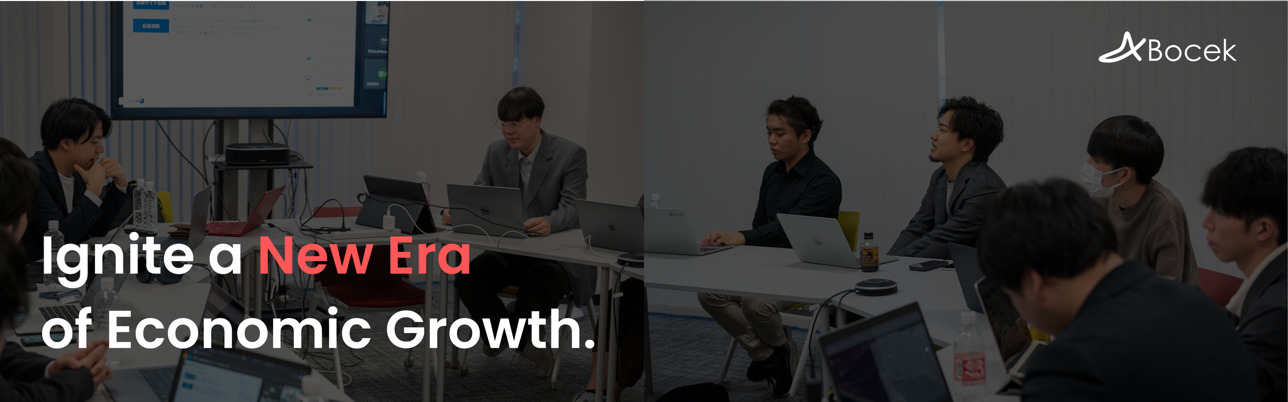 「2020年代から日本は変わったんだ。」 失われた30年を経て、どこか暗く、後ろ向きで、 どんよりとした重い空気が漂っています。 この日本経済に、再び勢いと華やかさが舞い戻る きっかけが生成AIの技術だと、私たちBocekは信じています。 人間が作り出す仕事の価値が最大限発揮され、 やりがいを感じ、目をキラキラと輝かせ、 情熱を燃やし、仕事を楽しむ。 世界のトップ企業として注目される企業が、 続々と登場する世界をつくります。 やってやりましょう。私たちと共に世界を驚かそう。