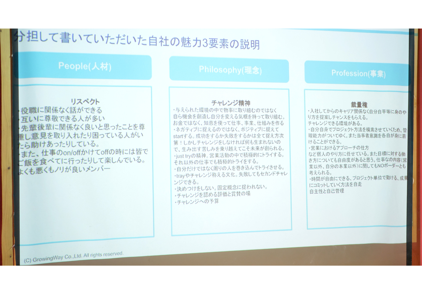 →経営陣と現場社員との打ち合わせで経営の開示や現場の声を遠慮なく交える事で組織の指針の統一を測りました。当社はオープネスを大切にしているので、情報・経営・自己の開示性を明確にする場ができたことはとても良い時間になりました。