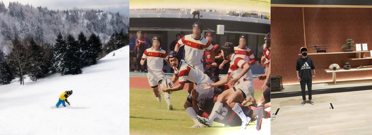 小学校時代は走ることが得意で学年1位のタイムだったこともあり、中学では陸上部に入部。高校では小柄な体格ならではのスピードを活かし、ラグビーで活躍することができました。残念ながら怪我が原因でラグビーは辞めてしまったのですが、大学から始めたスノーボードがメキメキと上達したので、今はシーズンになるとよく雪山に行っています!