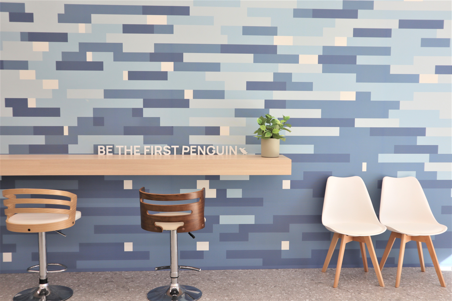 当社の特徴である新規事業立案コンテスト「ペンギンコンテスト」から着想を得て、このカウンター周りは海🌊をイメージしてデザインしました。