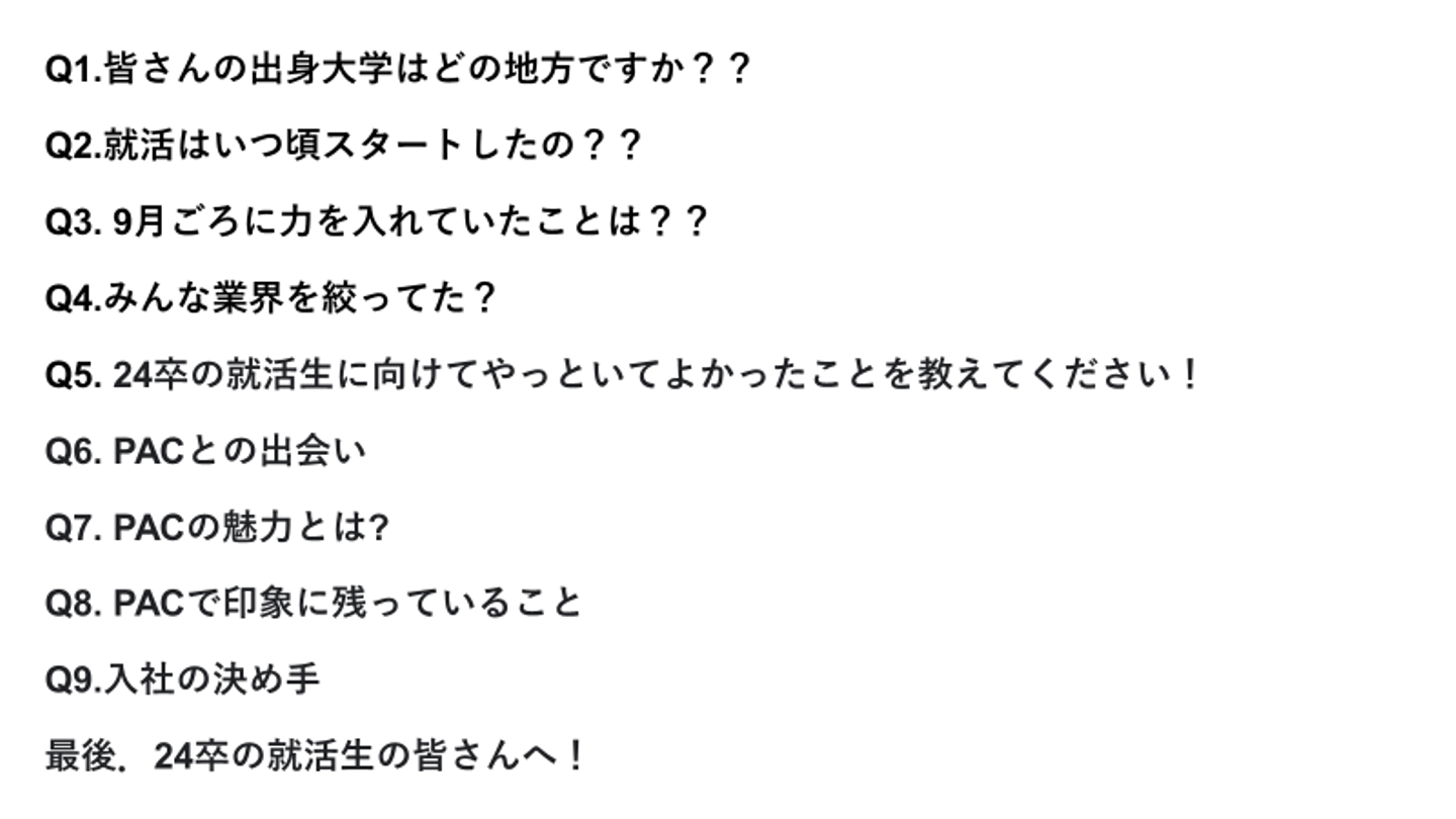 なので、私たちは、「23卒のPAC内定者の方々」、並びに、「実際にPACで働かれている先輩社員の方々」を対象に「アンケート」を行いました。