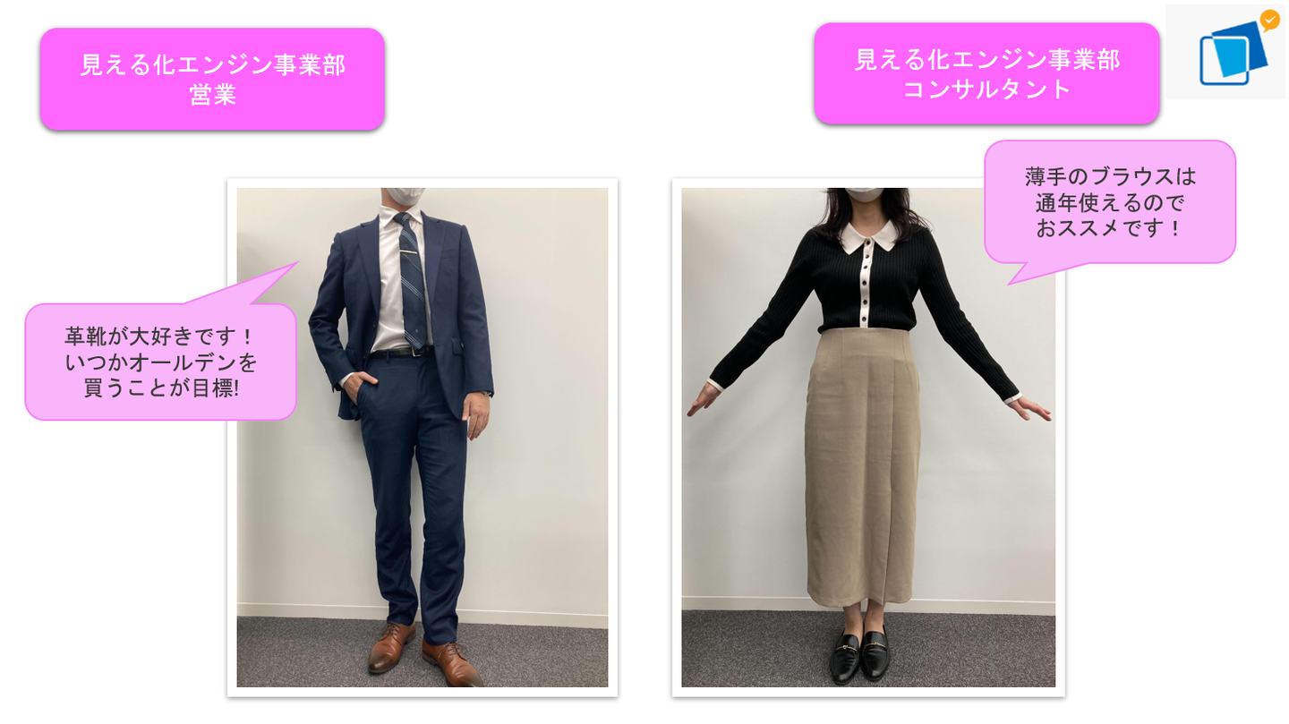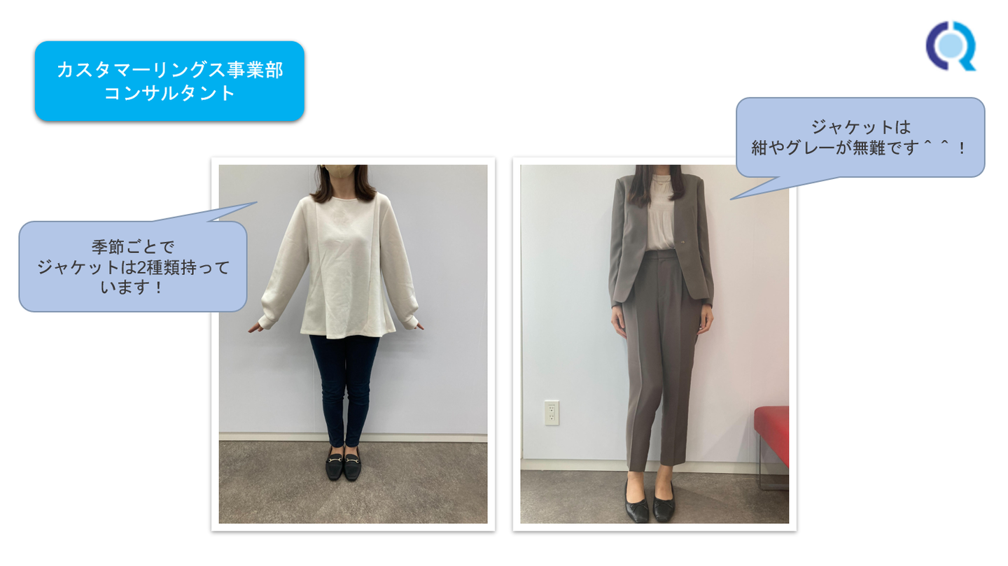 社内は空調によって同じような気温でいられるため、薄手のブラウスやニットがいくつかあれば、通年着れて着回しもしやすいといったお話もありました。
