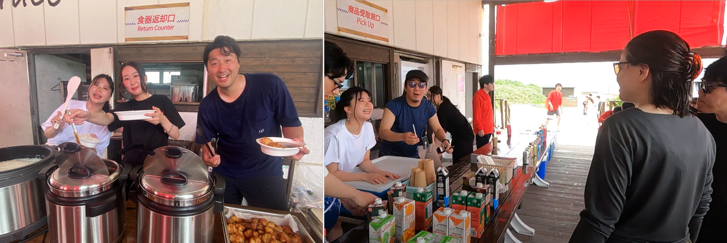 それぞれの班でマリンアクティビティが終わり島の中央に集まるとなんとそこには海の家が!