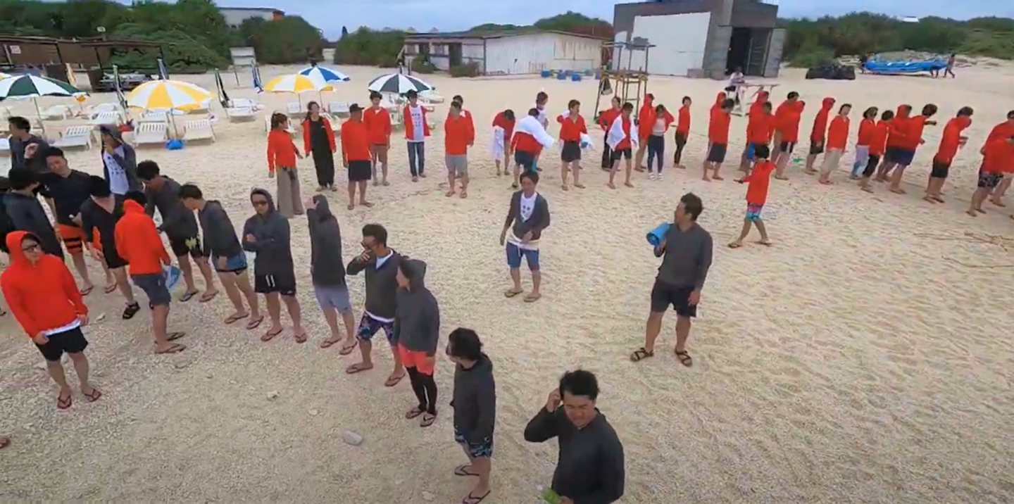 マリンスポーツを満喫し、お昼ご飯でお腹が膨れた私たちは1日目にトラべニアから配られた赤とグレーのラッシュガードをきて社員全員で砂浜に集まりました。