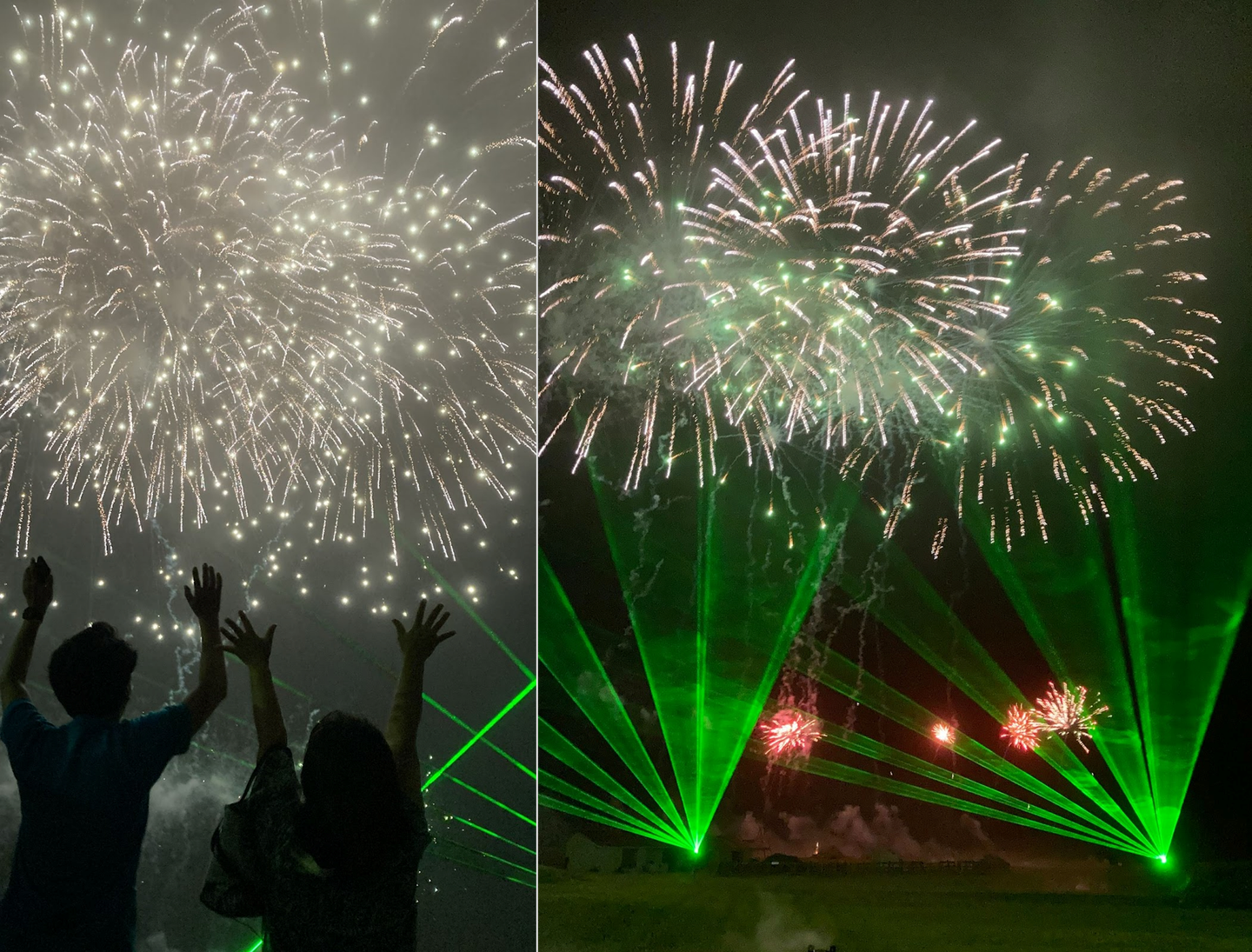 空に大きく描かれた緑色のレーザーは沖縄の空と完全に融合して、私たちは大きな歓声を上げずにはいられませんでした。