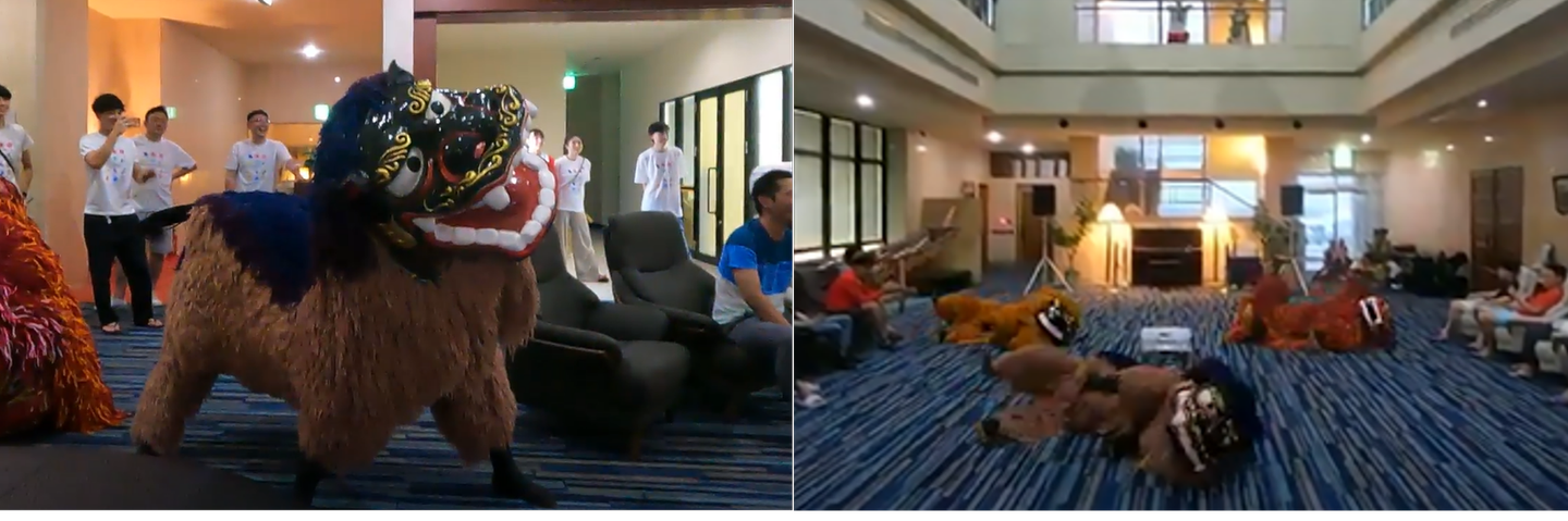 獅子舞の中には二人入っていて、ペアで一匹を演じているのですが、その動きはまるで意思を持った獅子が動いているかのようなコンビネーション。