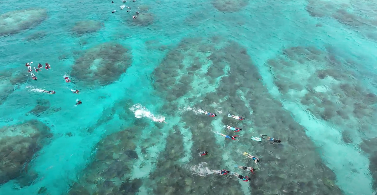 島の船乗り場からボートに乗り揺られること約5分。ライフジャケット・足ひれ・シュノーケリングを身にまとい、いざ海の中へ!青く透き通るような水面に顔を沈めるとそこにはサンゴ礁や色とりどりの魚の群れが泳いでいました。🐡