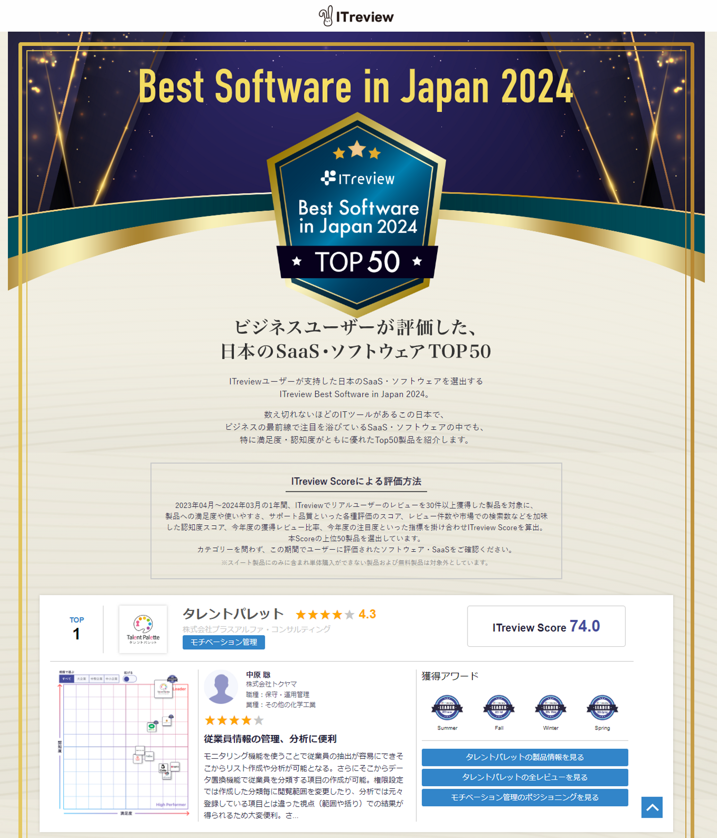 ITツールやSaasの口コミ掲載サイトである「ITreview」が、ユーザーから最も支持を集めたITツールトップ50をランキングにした「ITreview Best Software in Japan」を毎年発表しており、今年のランキングでタレントパレットが1位を獲得したのです!