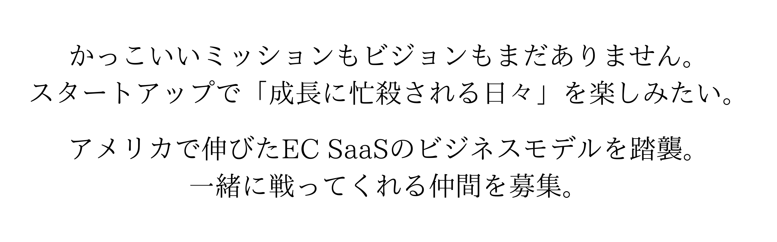 これまでCtoC教育事業やM&A事業などを手掛けてきました。 一念発起しスタートアップでJカーブを描ける事業を作っています。 3期目ですが新規創業のつもりで検証・組織作り・資金調達を進めています。 ECの成長余地とアメリカのスタートアップのビジネスモデルを掛け合わせたEC向けサービスで、一緒にバタバタ仕事を楽しめる仲間を探しています。