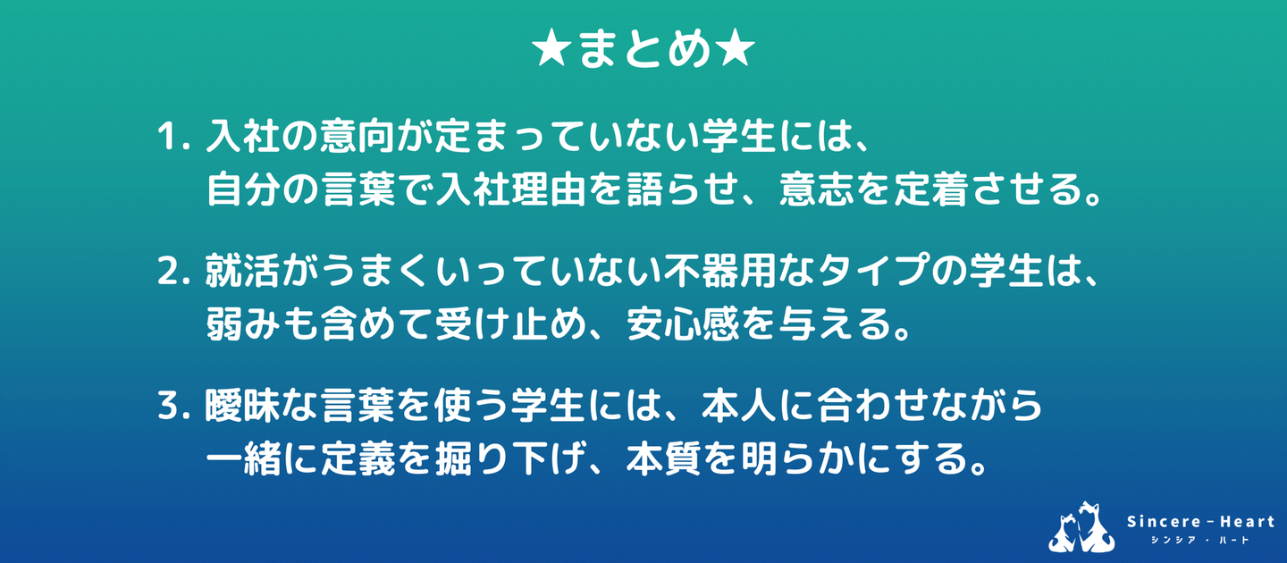 - 就活がうまくいっていない不器用なタイプの学生は、弱みも含めて受け止め、安心感を与える。