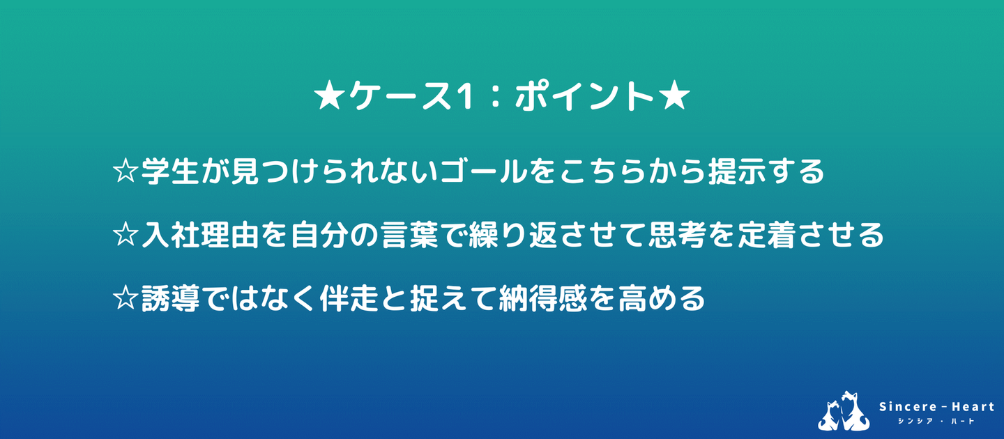 そうすると、だんだんと本人も自分の言葉で「自分はこういう理由で入社したい」「それなら絶対ここがいい」と話すようになります。それを繰り返していく中で、本人の中でもその思考が定着してくるので、入社の意志が強くなるはずです。