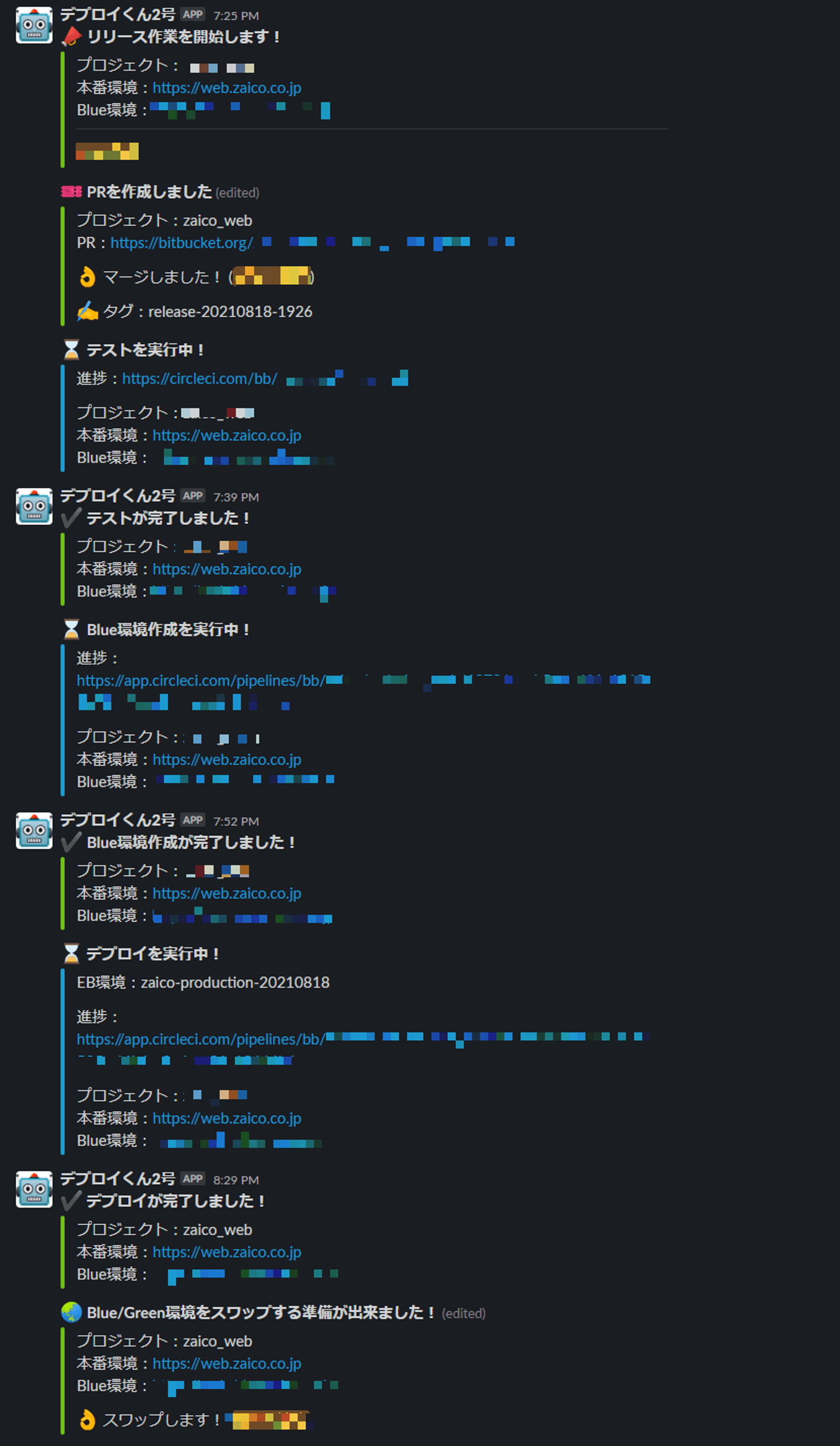 botを使ったデプロイ時のslackの様子です。