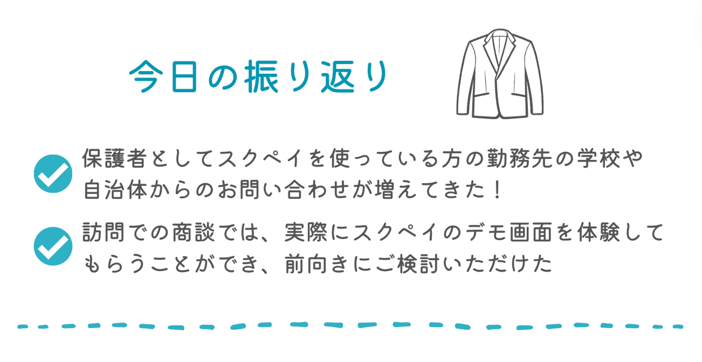 今日は、小学校2か所に新規で商談に訪問します。移動が多いので、オフィスには出社せずに直行直帰のスケジュールです。