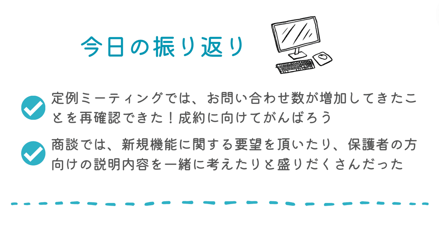 代表の齋藤や業務委託のメンバーも集まって、営業の振り返りを行います。KPIの達成度を確認するだけでなく、新たな営業手法の検討や、お客様からの声の共有など、毎回バラエティに富んだテーマについて話し合います。