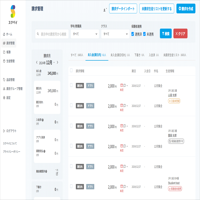 各ご家庭の入金情報を検索条件に合わせて確認することができます