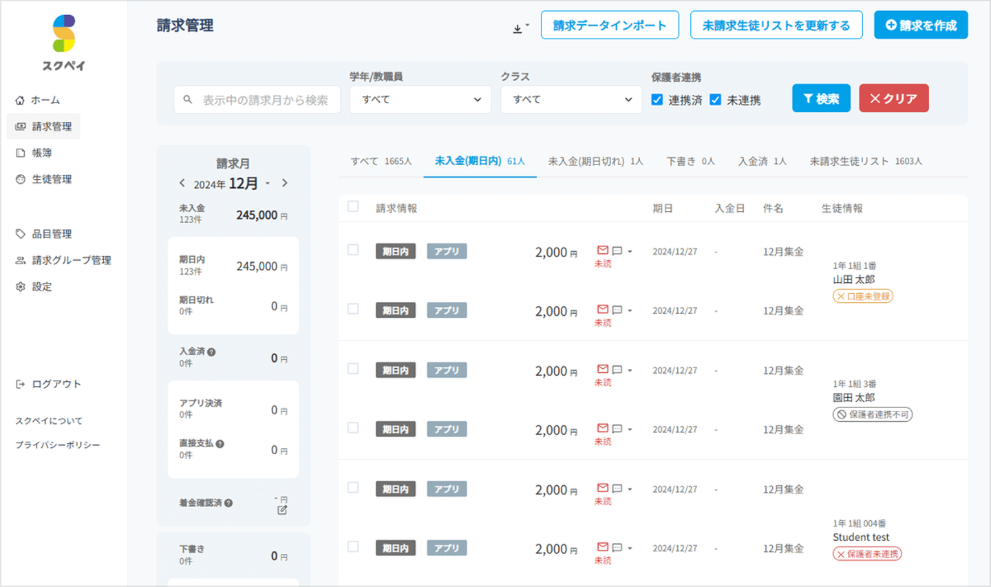 “未払いアラート”の機能は、未払いのご家庭が一目で確認できるので、非常に助かっている機能の一つです。