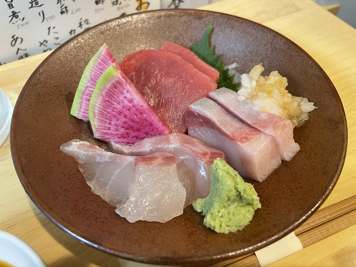 お造り三種盛り(その日の新鮮なお魚を出してくれるんです、人気で満席でした)