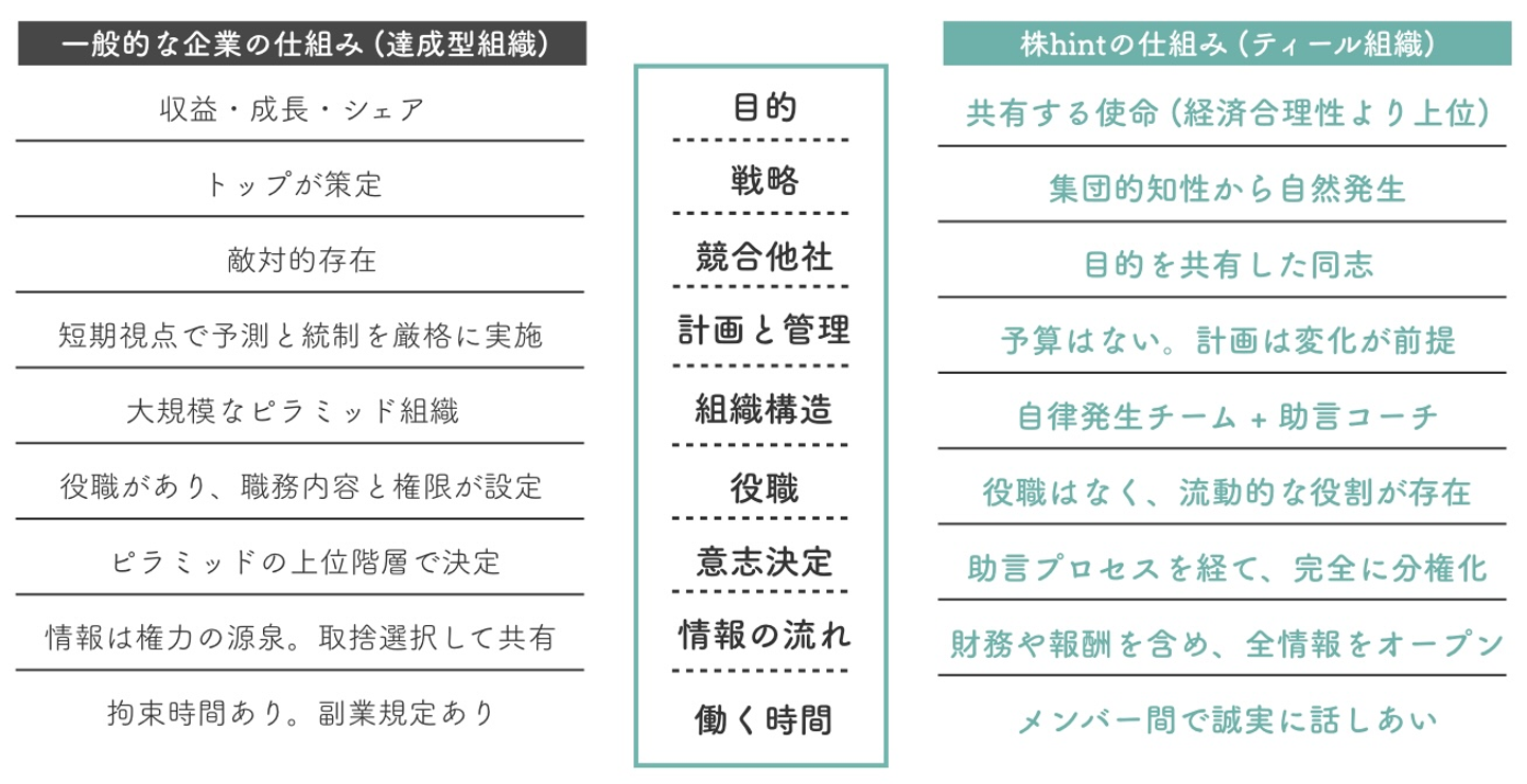 「ティール組織」という言葉も、hintに出会うまでは知らなかった私。こちらの表は、hintウェブサイトにも掲載している、hintのユニークな仕組み (ティール組織) の説明です。