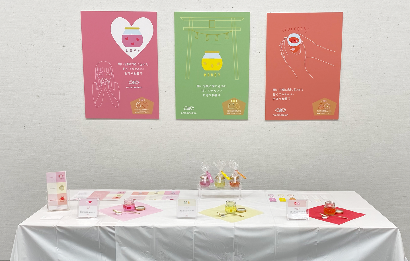 ↑小椋さんが、卒業制作を展示した時の写真。実際に店頭販売した際の商品、パッケージデザインした商品、商品のタグの中に入っているおみくじ。