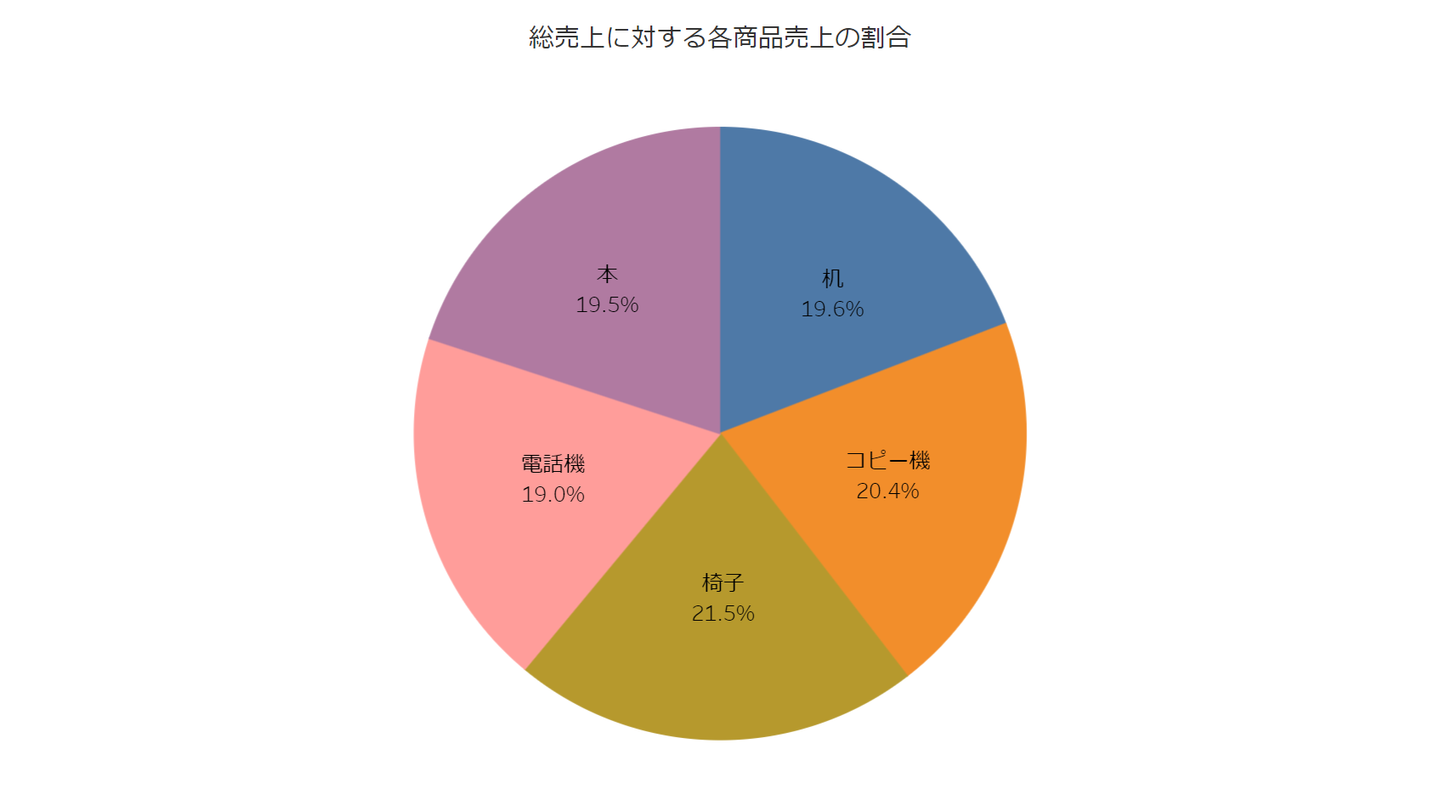 カテゴリごとの割合を扇形の領域で表現するグラフです。全体に対する部分の割合を示し、カテゴリ間の比較や相対的な重要性を視覚化します。ただし、データの比較や正確な数量の表現には向いていません。