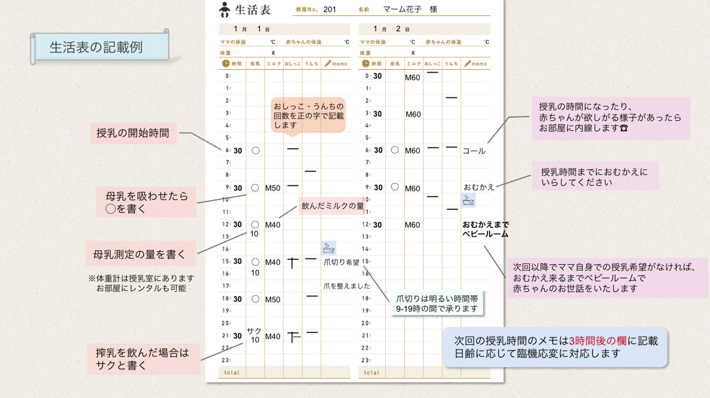 「そうですね。助産師間でも説明内容に差があったので、まず統一したいという考えがありました。そこから「お客様のため」を考え、シンプルで分かりやすいオペレーションを作りたいと思い、絶対に伝えなきゃいけないことだけをギュッとまとめた『案内スライド』を自作しました。 これを時間があるときにゆっくり見れるために、チェックイン前にスマホで見れるようにしたり、お部屋に冊子として置くことで、説明時間を大幅に短縮できるようにしました」
