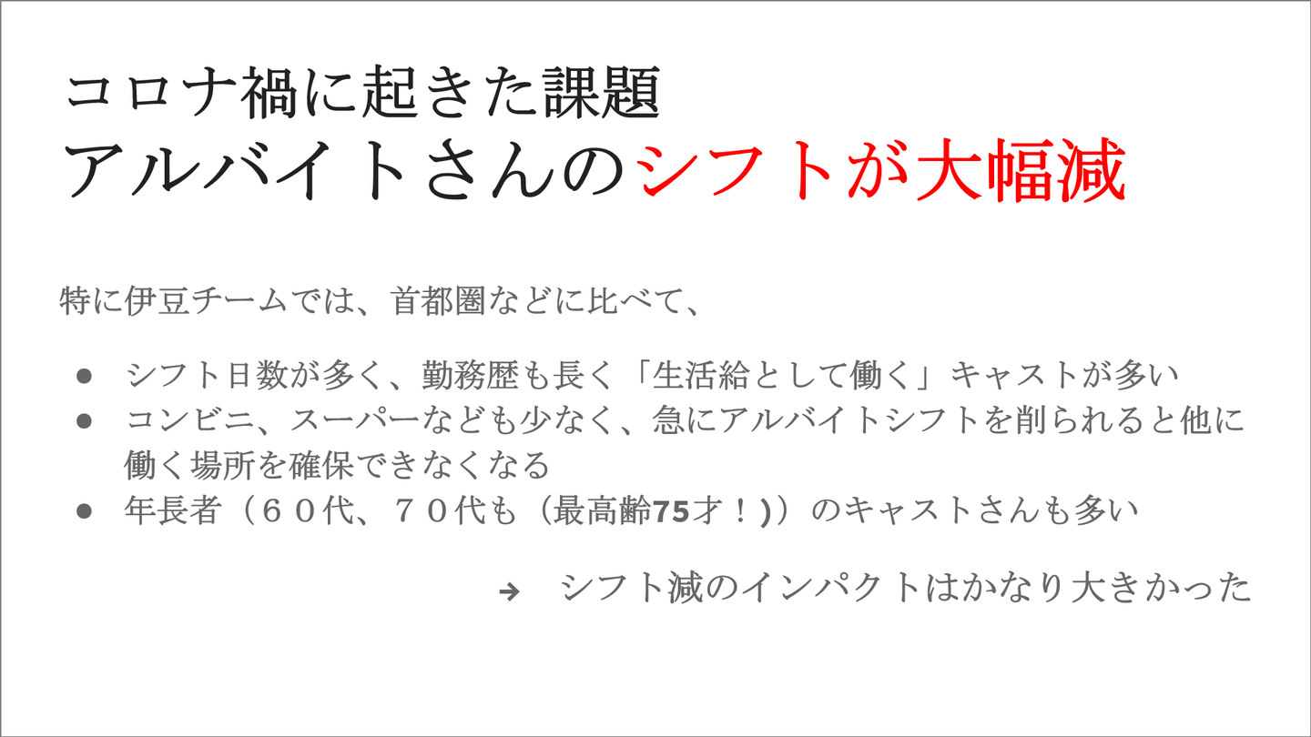 また首都圏と違い、周辺にコンビニやスーパーといったお店も少ないため、アンダグループでのシフトが少なくなっても埋め合わせに他社さんで働く、ということが難しい。かつ、定年を過ぎた年長者(60代、70代)のキャストさんも多く、営業自粛でシフトが減ってしまったインパクトはかなり大きかったと言えます。