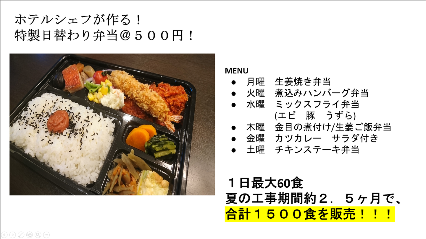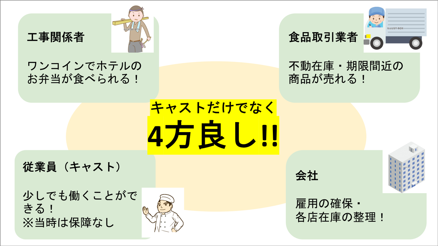 またキャストのみならず、工事関係者はホテルのお弁当がワンコインで食べられる、食品取引業者は不動在庫の整理ができる、会社としては雇用確保ができる、といった4方良しの結果となり、このつらい時期に少しでも笑顔が見られたのではないかと思います。