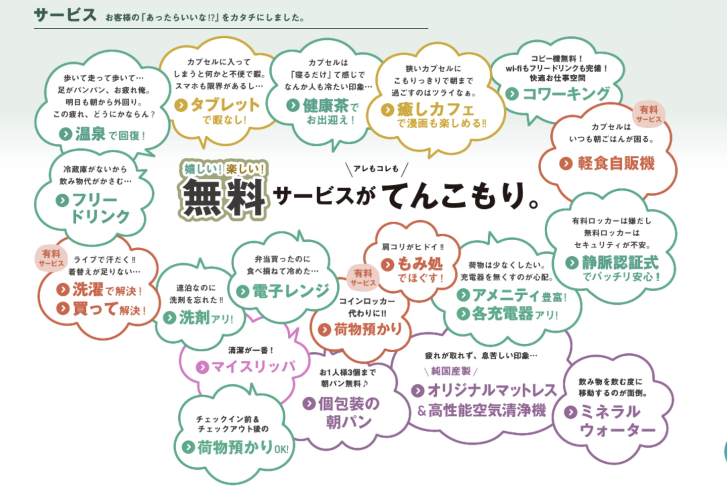その他、ご飯やマッサージチェアも揃っていて、駅近だし、近くにコンビニもあるし、