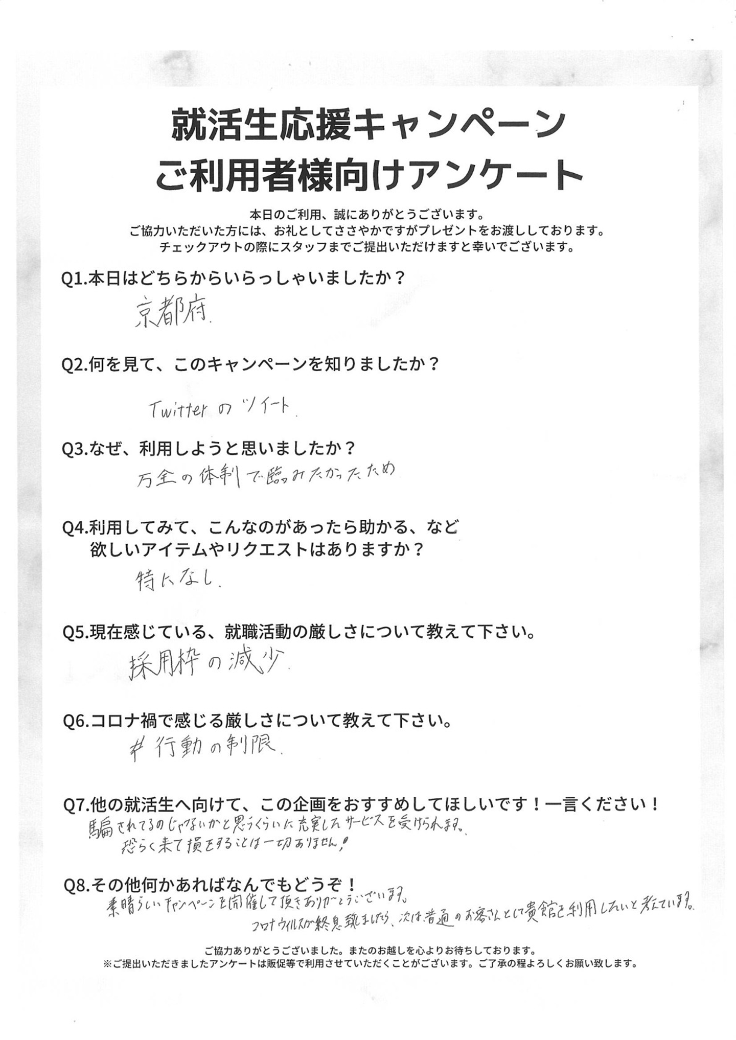 コロナ禍での就活は、例年に比べてだいぶイレギュラーで、閉鎖的になりかなりストレスも溜まってしまうことが伝わって来ました。気分転換するにもしようがないこの状況下、自分でどうにかリラックスしなくてはならないですよね。その一つとして、私たちのキャンペーンを利用してもらって少しでも安らげるといいなと思います!!