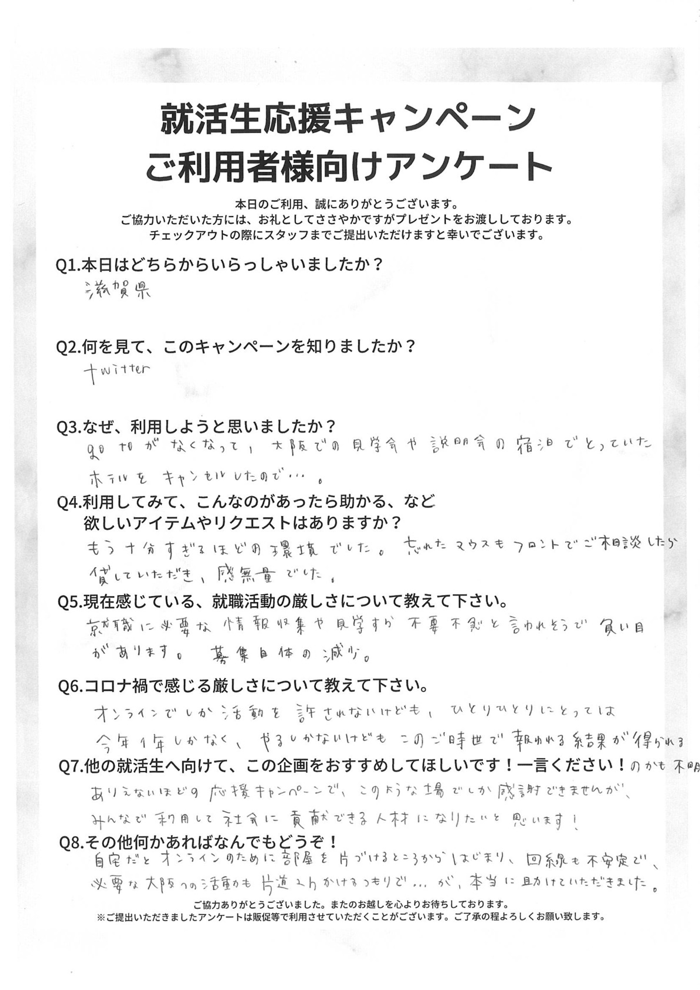 A.兵庫県尼崎からです!就活のためにインターネットでホテルを探していたら、見つけました!