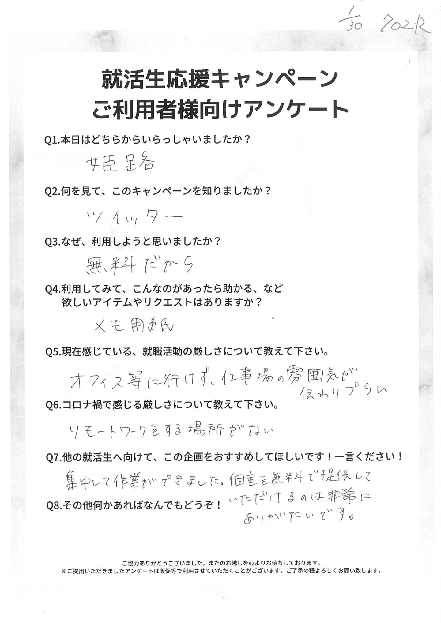 A.就活の作業は、大学の図書館、カフェ、ファミレスを利用していました。でも、緊急事態宣言で20:00にしまってしまうんです...。なのでとても助かりました!!