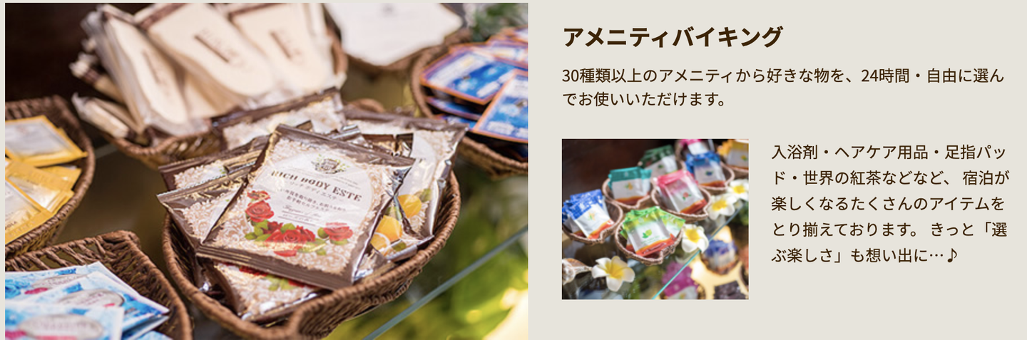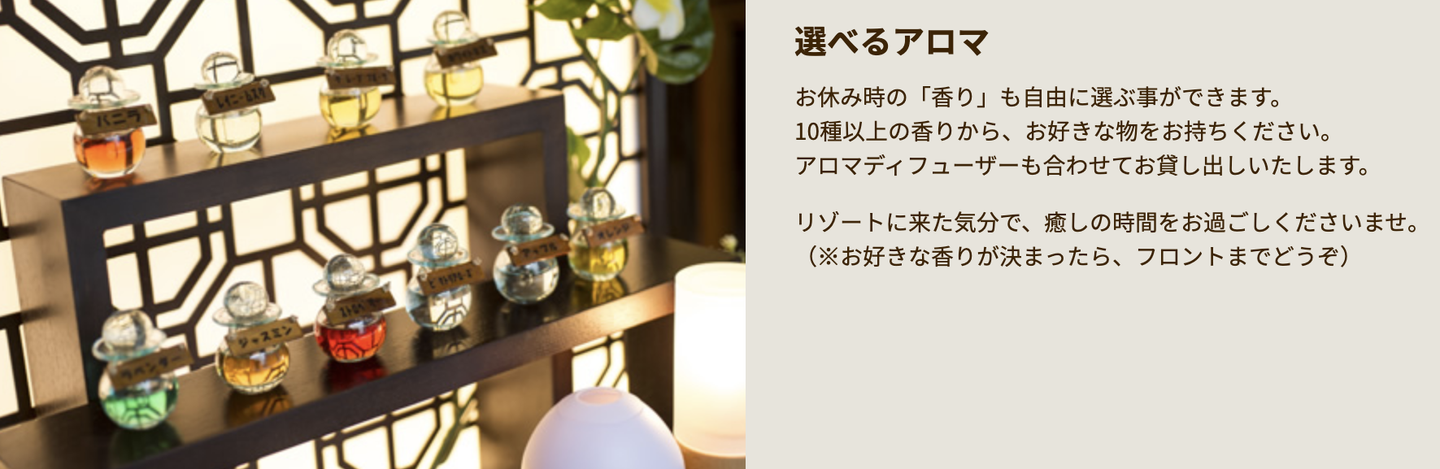 A.アロマがすごくよかったです!なかなか他のホテルにはないし、女性には刺さるな〜と思いました。シャンプーの種類も豊富で、女性が喜ぶリラックスグッズがたくさんあってよかったです。