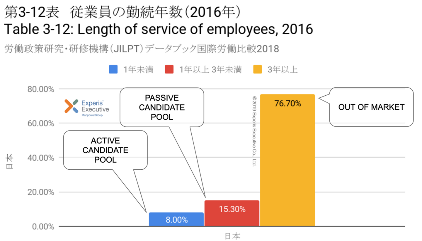 2016年のデータによると、働く日本人の75%が3年以上の同じ勤務先に留まり、44%が10年同じ勤務先に留まっています。さらにそれらのうち、22%は20年以上同じ職場に勤続しています。あなたの会社が求人を始めた時に、これらの人たちは関心を持って求人を見ているのでしょうか。どうやら彼らの多くが蚊帳の外のようです。実際、2015年または2016年に、日本で転職したビジネスパーソンは、全体のわずか8%です。ちなみに、2016年にアメリカでは22.6%が、お隣の韓国では31.5%が転職を経験しているにも関わらず、です。