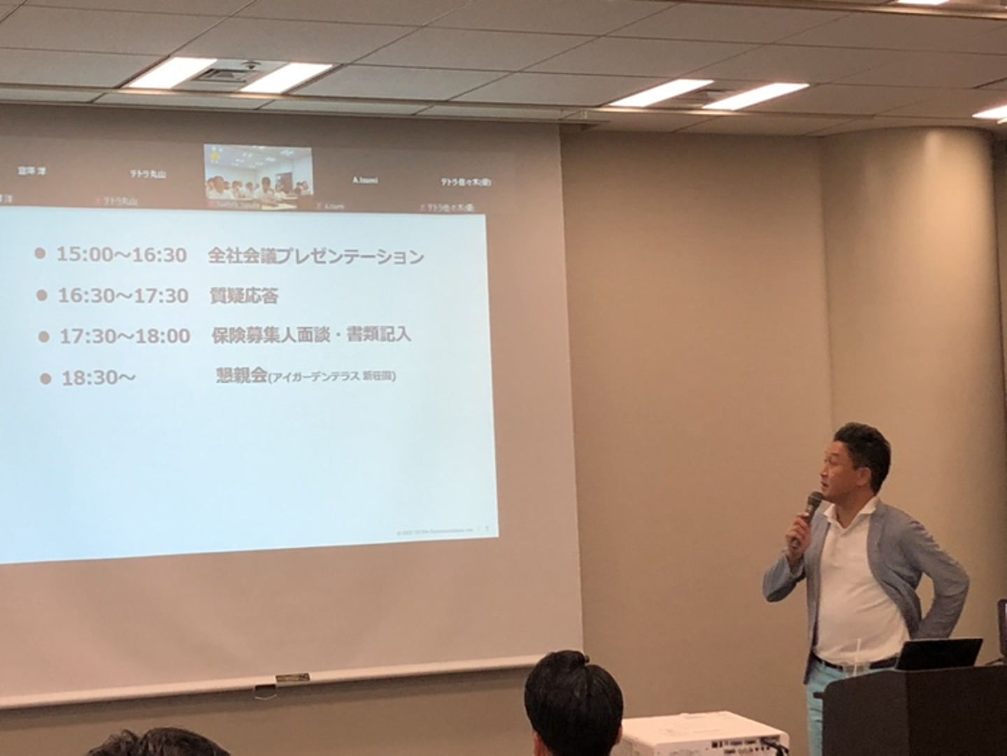 組織の話の中で、新規入社メンバーの紹介とひとこと挨拶の時間があります。