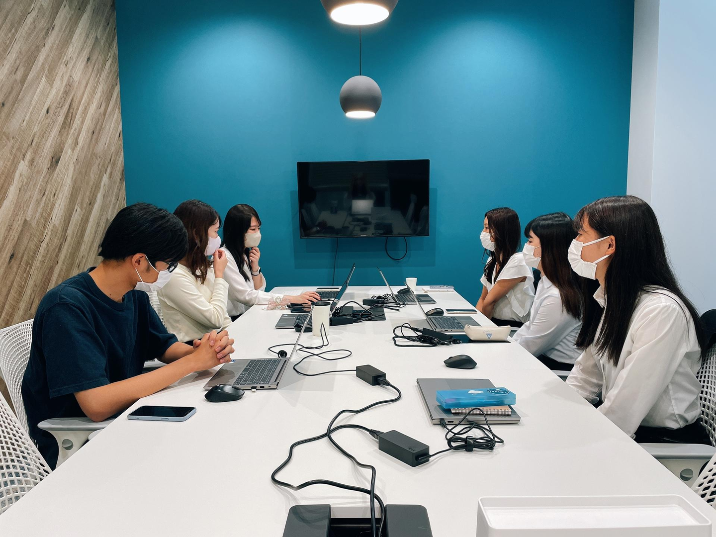 「なるべく社員と関わってほしい」、「自分から先輩社員に話しかけ、質問することを体感してほしい」という想いから、会議室など別室ではなく、社員たちのデスクスペースのすぐ横にあるフリーアドレスの席でマーケティングの実践の作業をしてもらう時間も設けました。