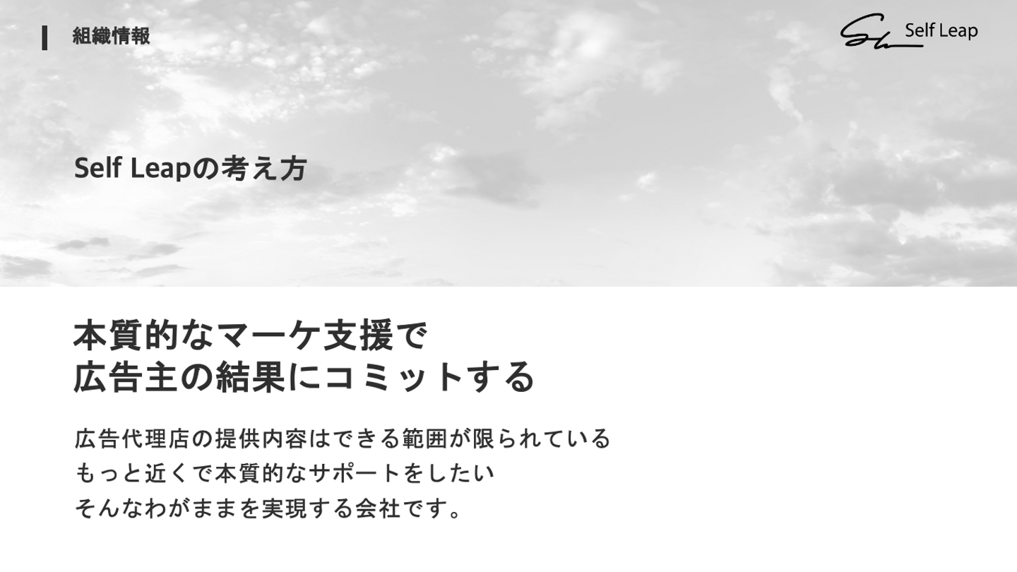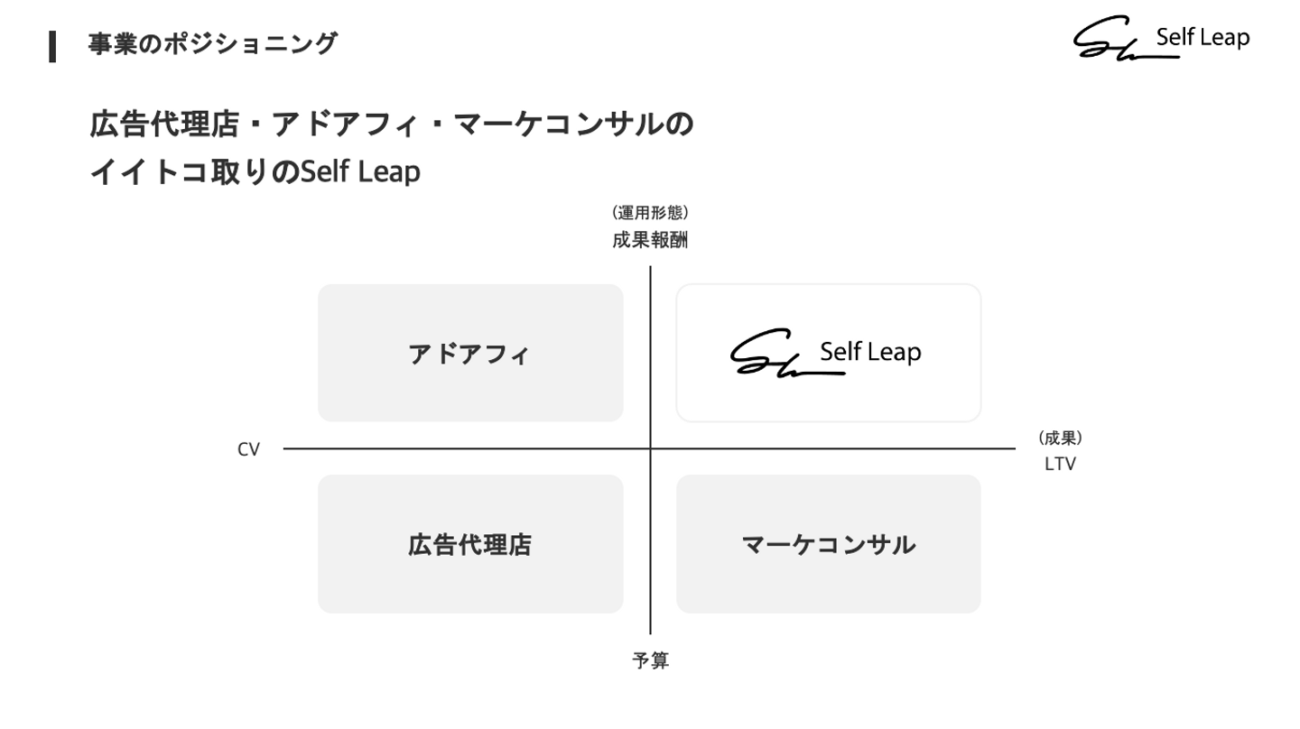 株式会社Self Leapは、企業のLTVやROAS、ROIなどの改善に特化したマーケティング支援を展開しているマーケコンサルベンチャーです。