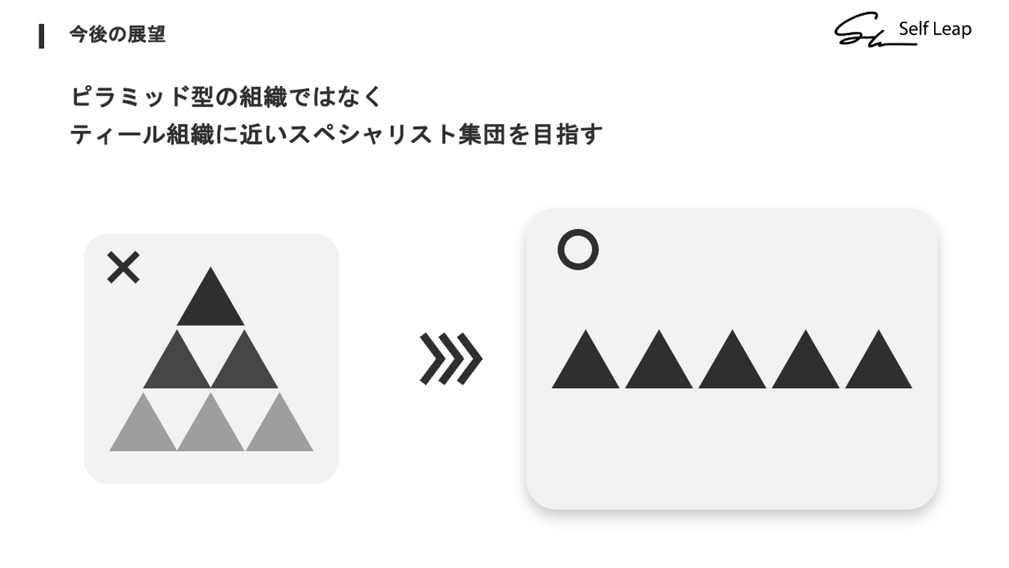 よくあるピラミッド型の組織ではなく、全員が自律・自走し役割を全うするティール組織に近い組織にしていきたいと考えています。