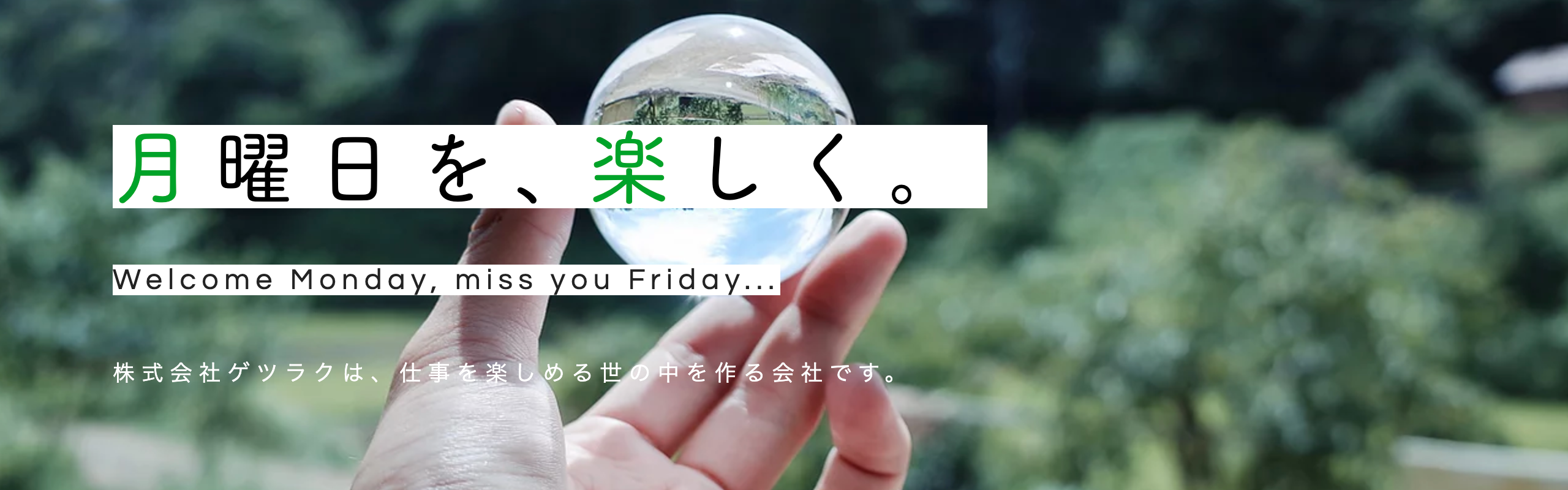 せっかく働くなら楽しく働きたい。 これは働く人みんなの考えだと思います。 自分に本当にあったスタイルを見つけ、胸躍らせながら働く。 お互いの仕事を尊重し、賞賛しあえる。 そんな世界を作り上げることが、株式会社ゲツラクのミッションです。