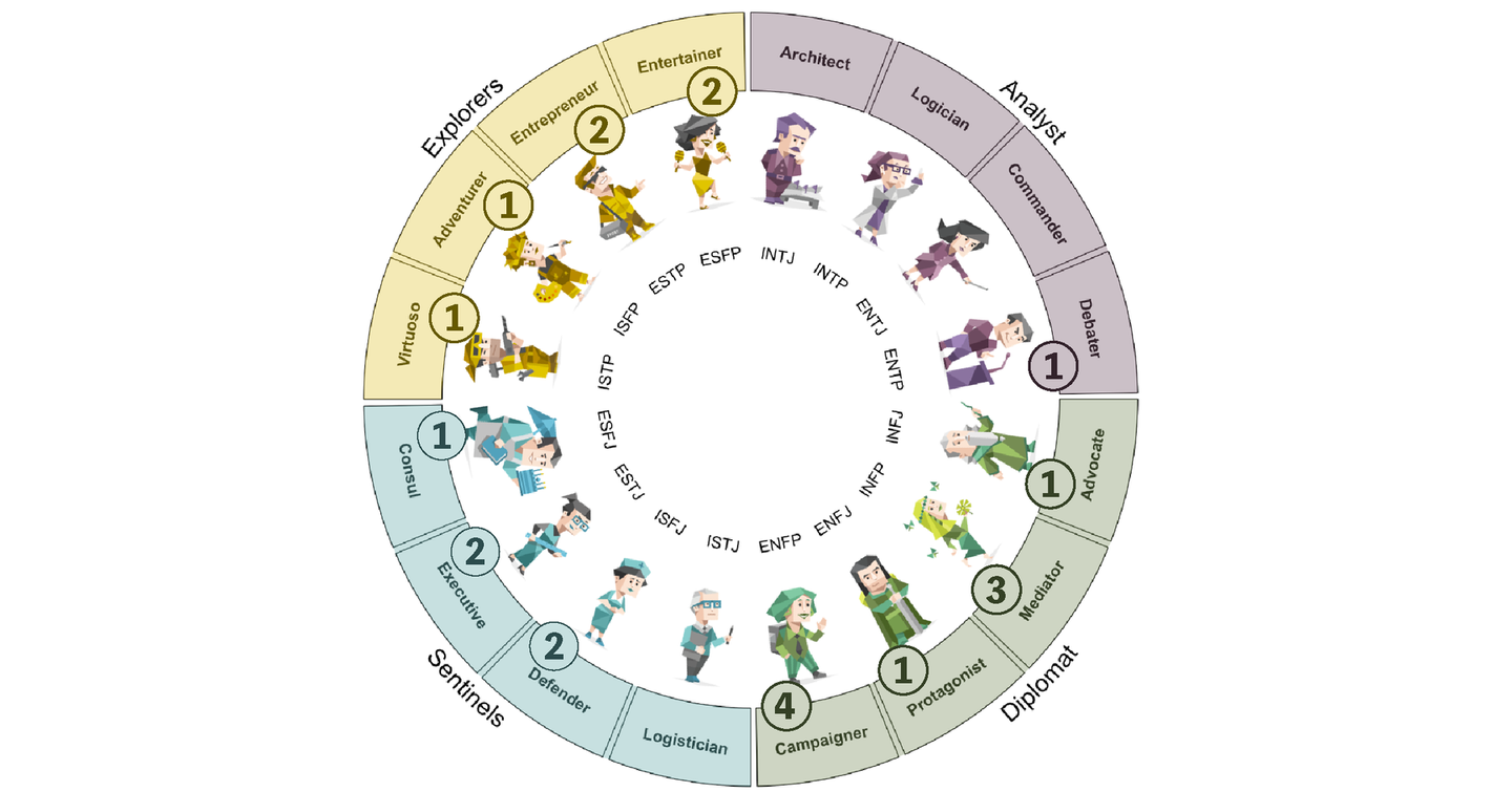 4つの心理的領域(感覚・直観・感情・思考)について、個人の性格を16種類に分類する性格診断です。