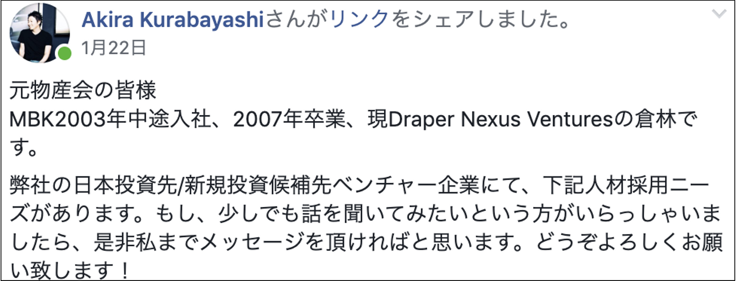 アダコテックに入社を決めたのは、今年の年初にDNX Venturesの倉林さんがFacebookのグループ「元物産会*」に投じた一つの投稿がキッカケでした。