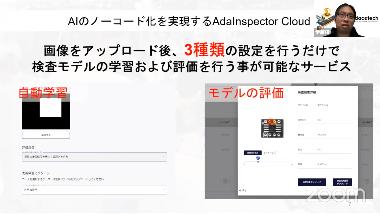 ・弊社が昨年末にリリースしたAIのノーコード化を実現するAdainspector Cloudの説明