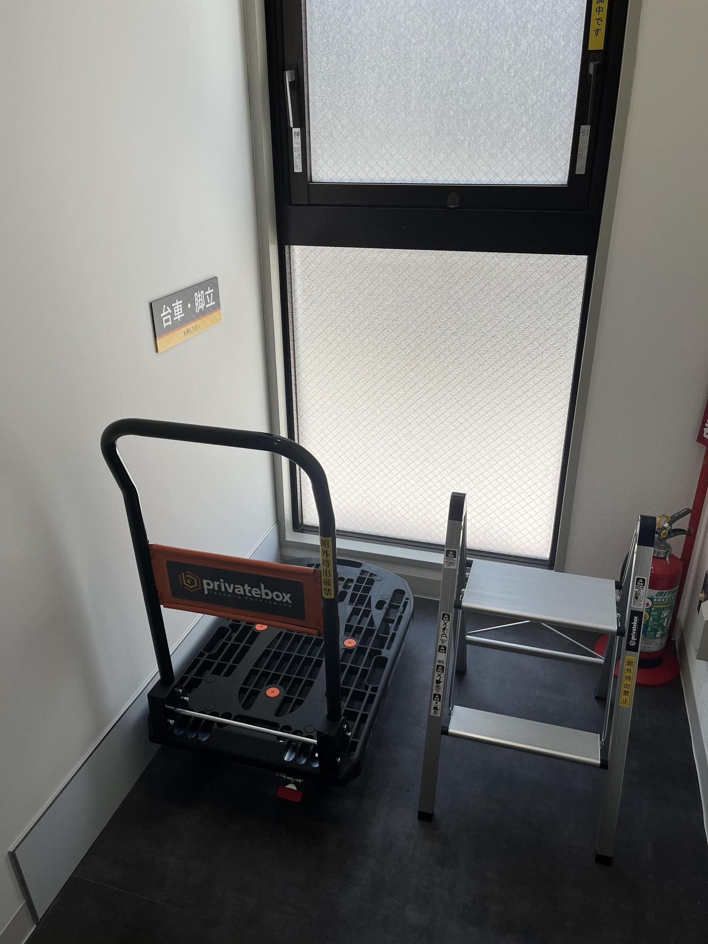 入口扉の正面反対側に、台車と脚立がありました。
