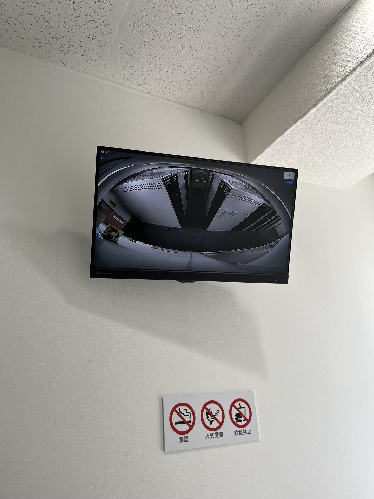 看板右上には監視カメラのモニターがあり、施設内のカメラ映像が切り替わり流れています。