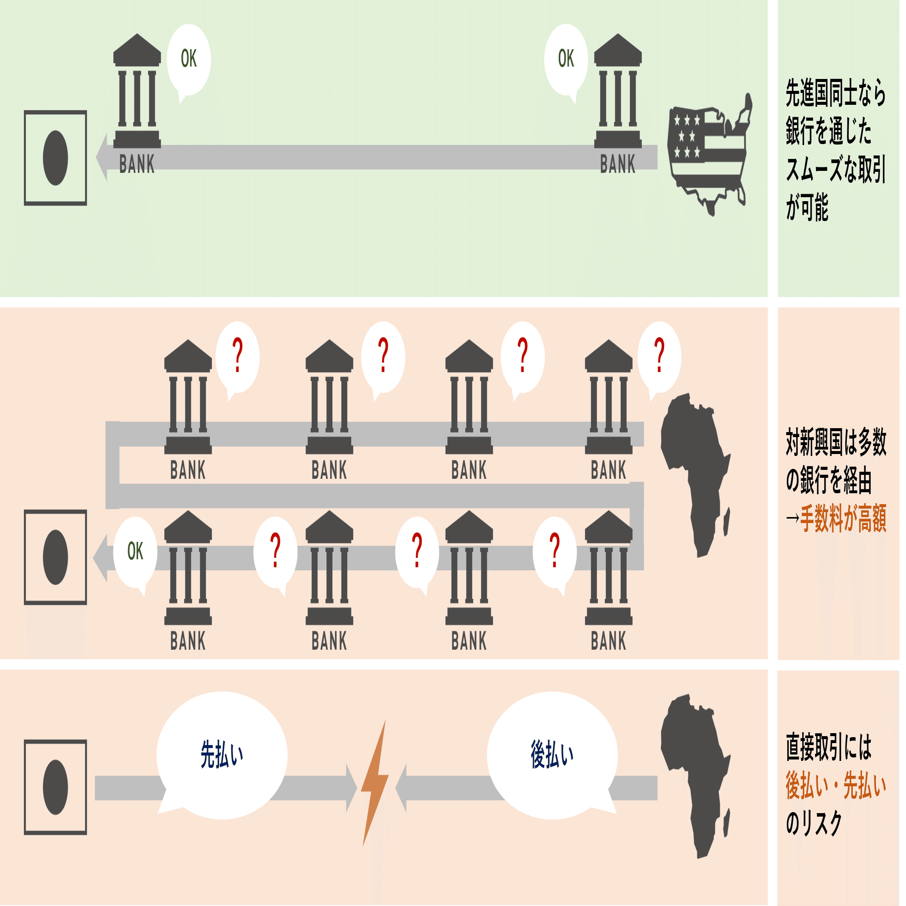 日本とアメリカなど、先進国同士の貿易取引であれば、世界の銀行ネットワークSWIFTをつかって、ある程度スムーズに貿易決済を行うことができます。