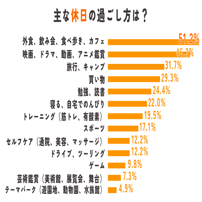 一方で、映画や動画鑑賞、読書や勉強、自宅でのんびりなど、ゆったり休養したり自己研鑽に充てたりしている人の割合も、想像以上に高かったです。